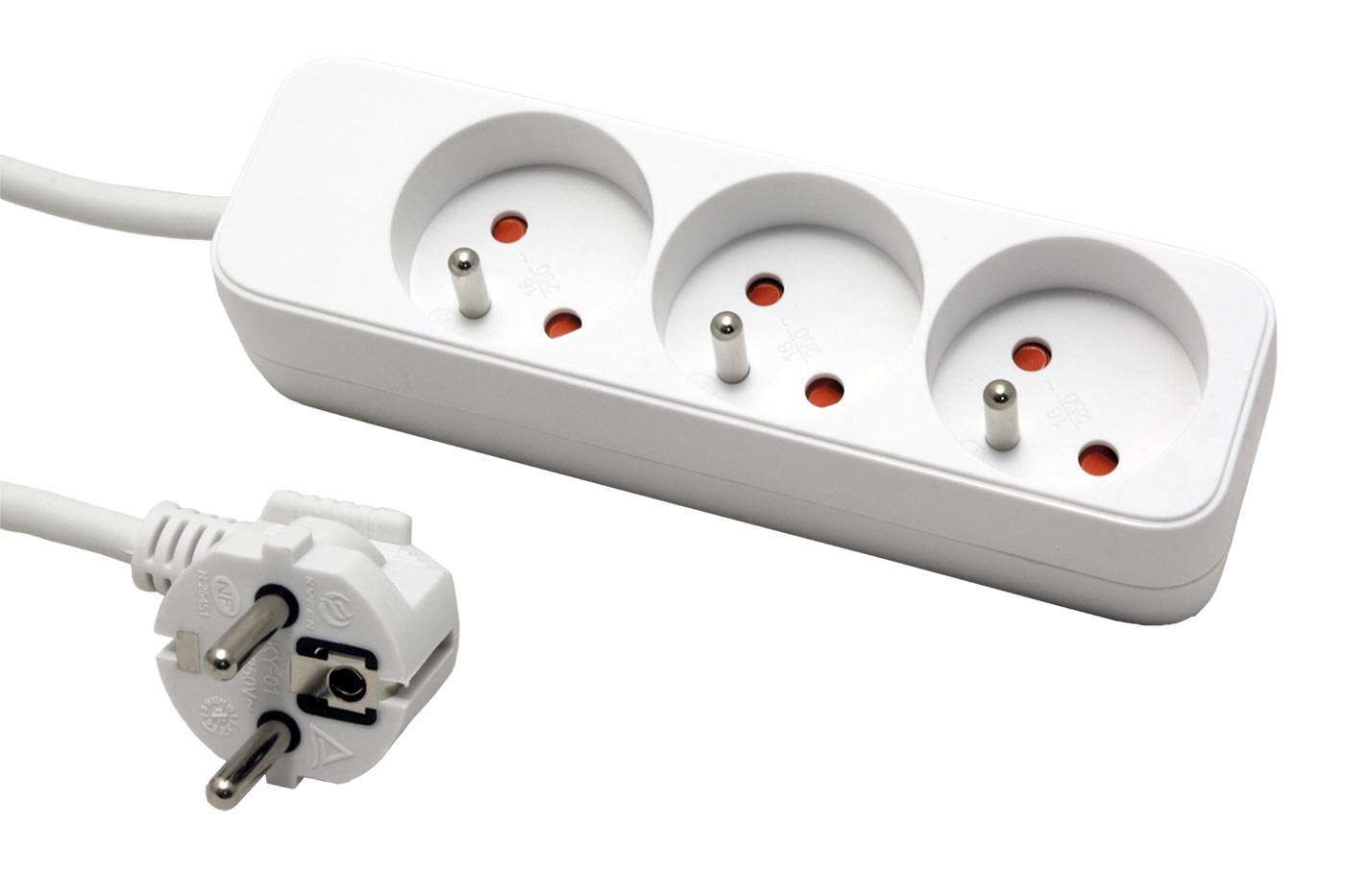 Trojnásobná zásuvka s prodlužovacím kabelem. Zásuvky typ E (české), vidlice typ E/F (univerzální pro zásuvky s ochranným kolíkem nebo bočními kontakty).