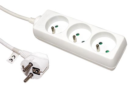 Trojnásobná zásuvka s prodlužovacím kabelem. Zásuvky typ E (české), vidlice typ E/F (univerzální pro zásuvky s ochranným kolíkem nebo bočními kontakty).