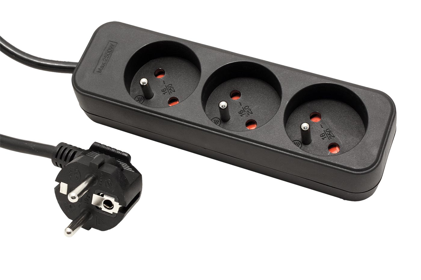Trojnásobná zásuvka s prodlužovacím kabelem. Zásuvky typ E (české), vidlice typ E/F (univerzální pro zásuvky s ochranným kolíkem nebo bočními kontakty).