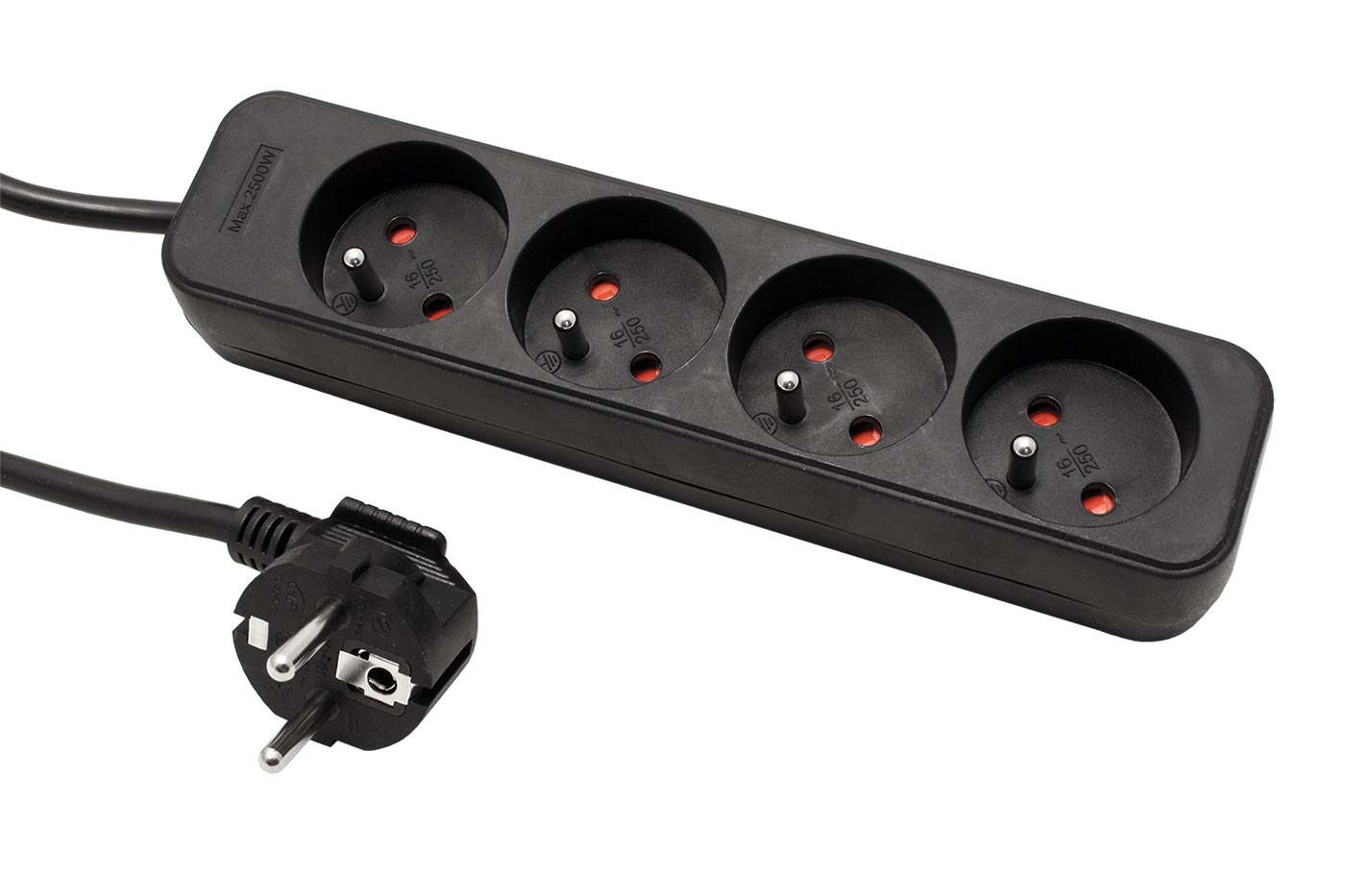 Čtyřnásobná zásuvka s prodlužovacím kabelem. Zásuvky typ E (české), vidlice typ E/F (univerzální pro zásuvky s ochranným kolíkem nebo bočními kontakty).;