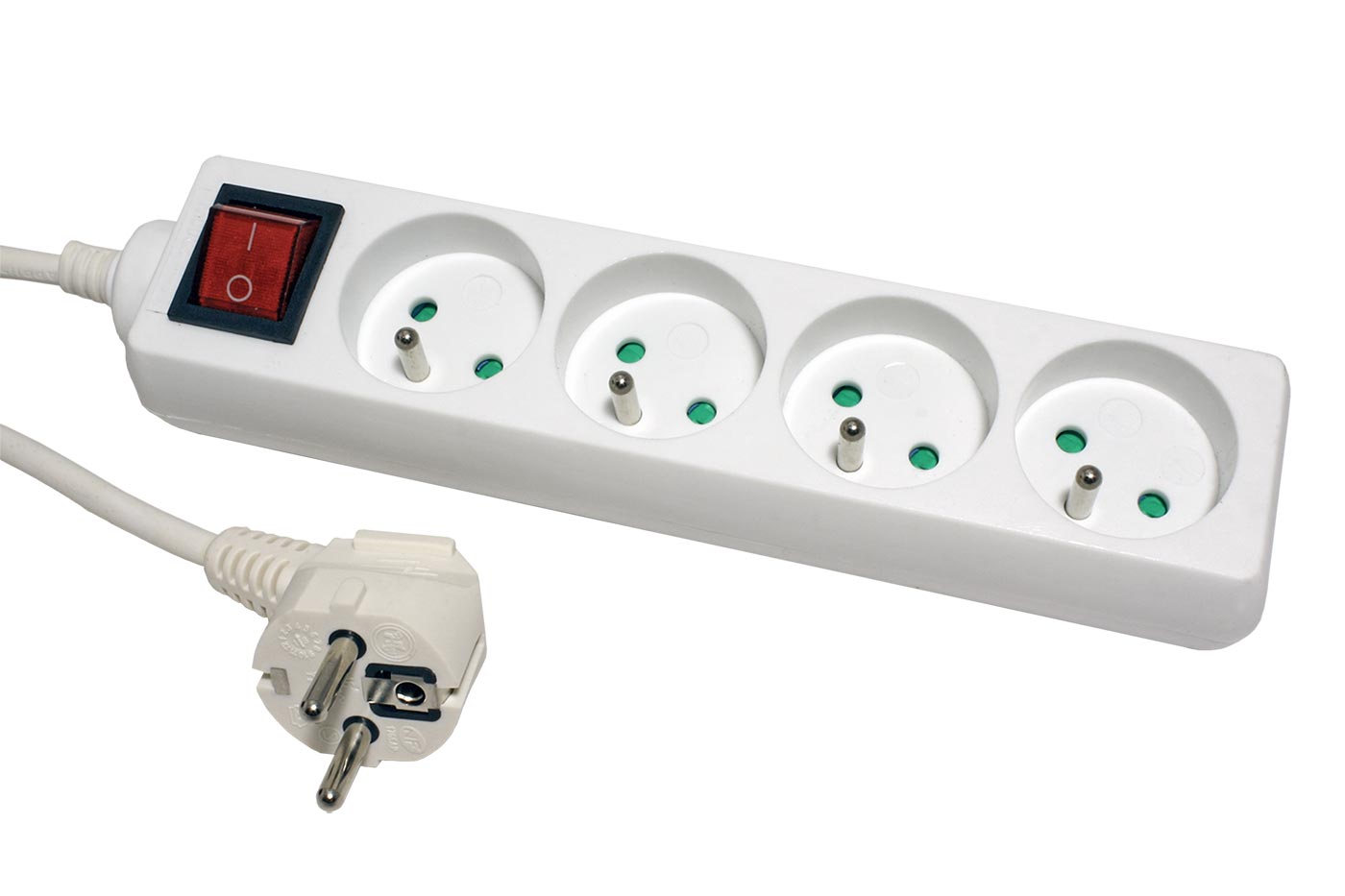Čtyřnásobná zásuvka s vypínačem a prodlužovacím kabelem. Zásuvky typ E (české), vidlice typ E/F (univerzální pro zásuvky s ochranným kolíkem nebo bočními kontakty).