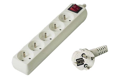 Pětinásobná zásuvka s vypínačem a prodlužovacím kabelem. Zásuvky typ E (české), vidlice typ E/F (univerzální pro zásuvky s ochranným kolíkem nebo bočními kontakty).