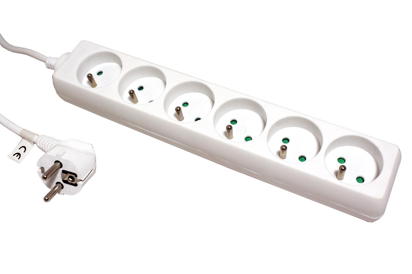 Šestinásobná zásuvka s prodlužovacím kabelem. Zásuvky typ E (české), vidlice typ E/F (univerzální pro zásuvky s ochranným kolíkem nebo bočními kontakty).;