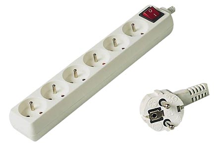 Šestinásobná zásuvka s vypínačem a prodlužovacím kabelem. Zásuvky typ E (české), vidlice typ E/F (univerzální pro zásuvky s ochranným kolíkem nebo bočními kontakty).