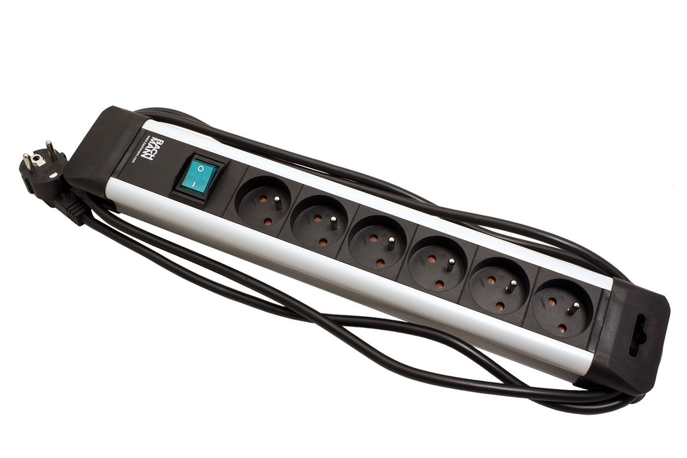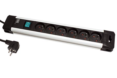 Šestinásobná zásuvka s vypínačem a prodlužovacím kabelem. Zásuvky typ E (české), vidlice typ E/F (univerzální pro zásuvky s ochranným kolíkem nebo bočními kontakty).;