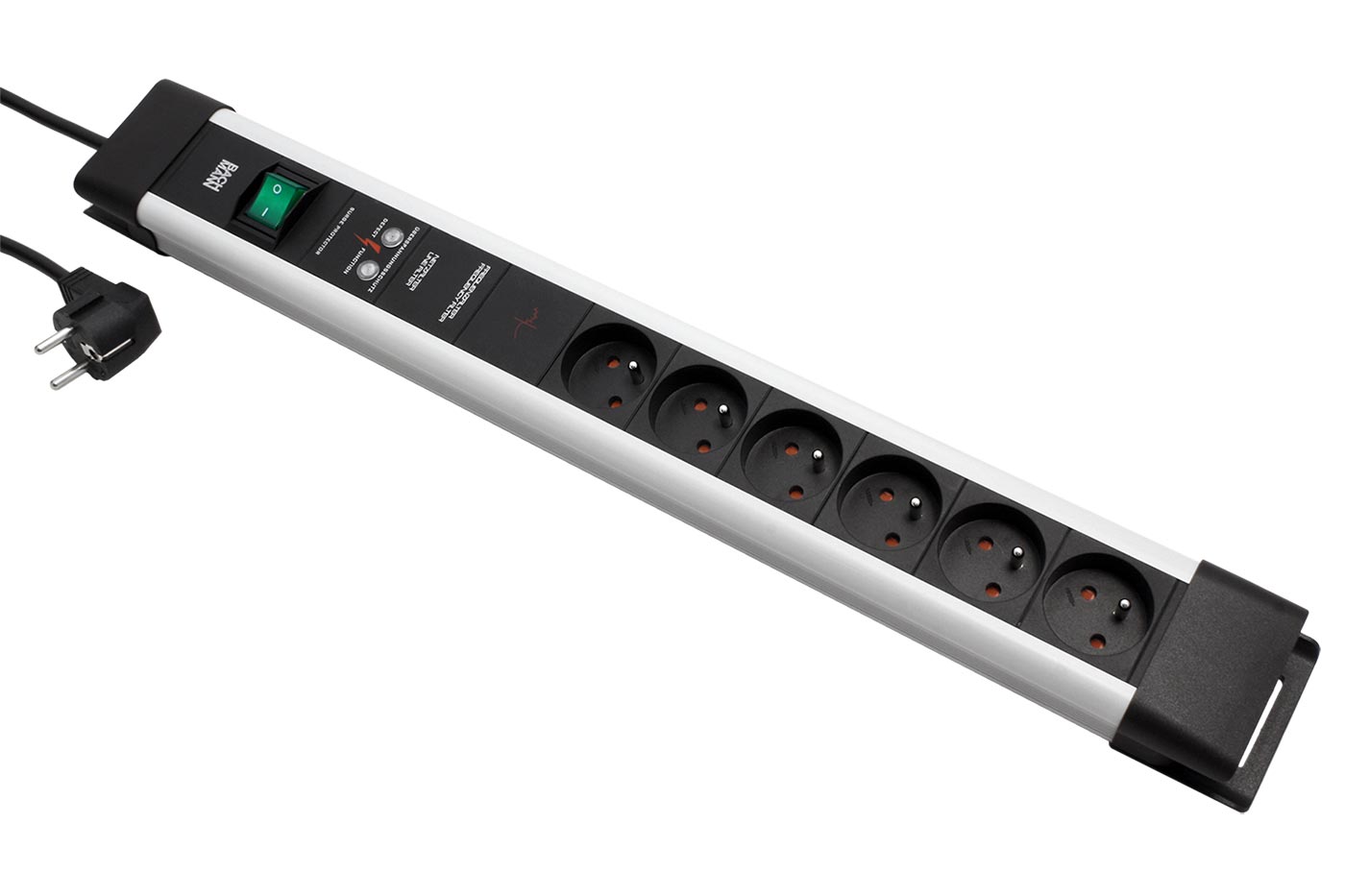 Šestinásobná zásuvka s vypínačem, přepěťovou ochranou, odrušovacím filtrem a prodlužovacím kabelem. Zásuvky typ E (české), vidlice typ E/F (univerzální pro zásuvky s ochranným kolíkem nebo bočními kontakty).