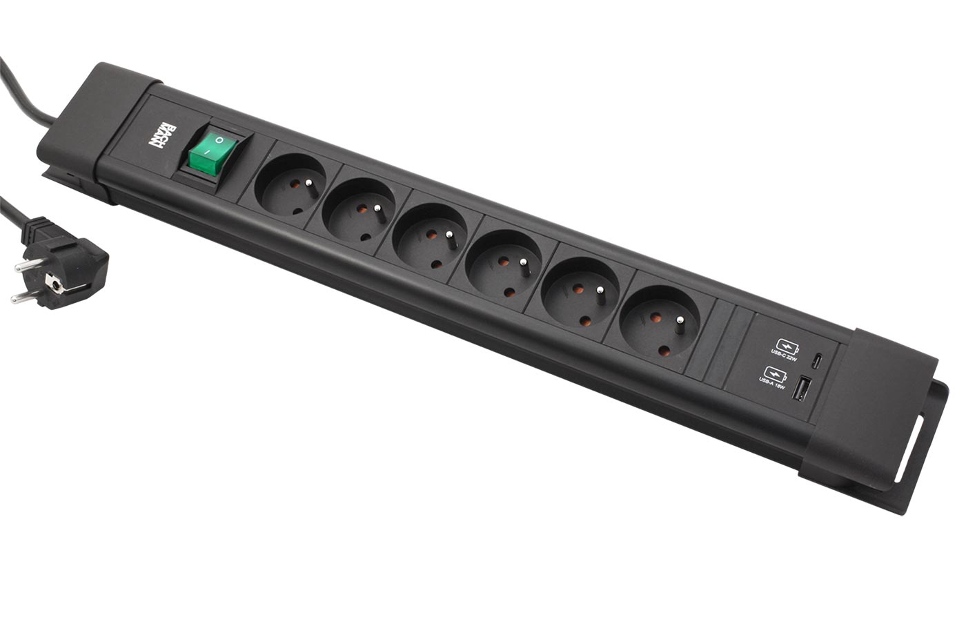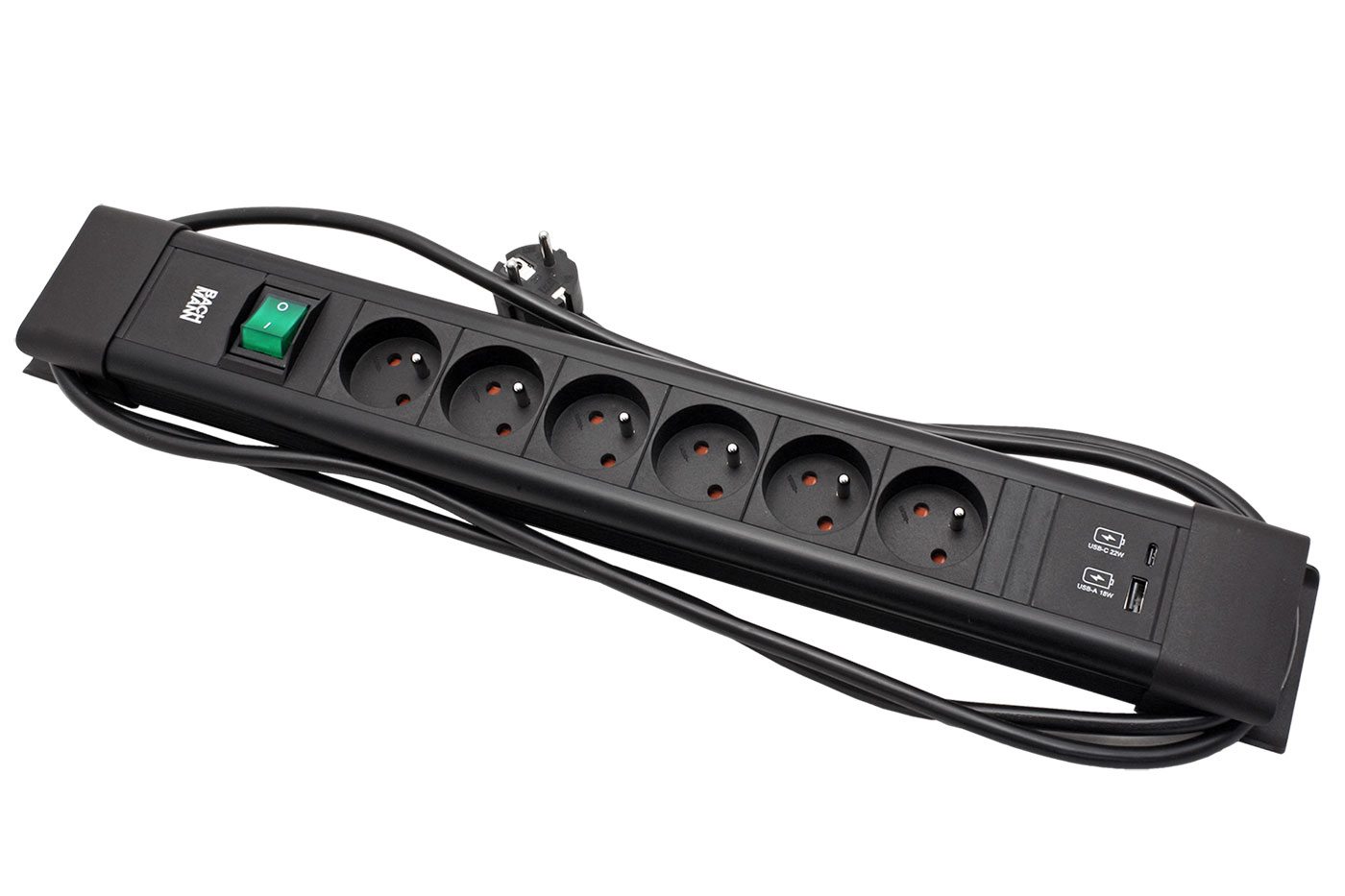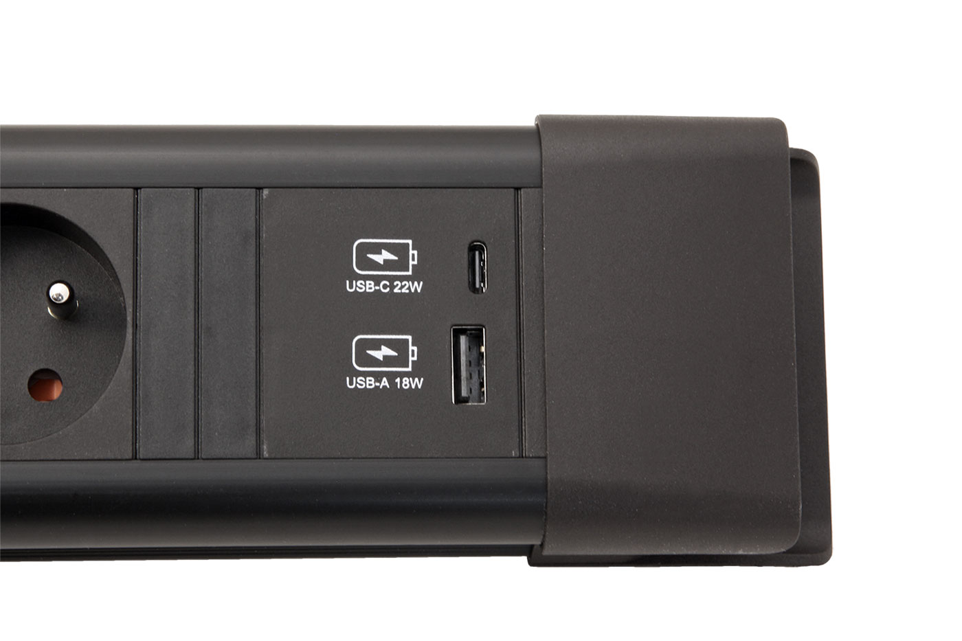 Kompaktní přípojné místo se síťovými zásuvkami s možností navinutí kabelu na tělo zásuvky a zavěšení. Obsahuje napájecí modul 22W (USB A + USB C). S vypínačem pro vypnutí všech zásuvek najednou.
