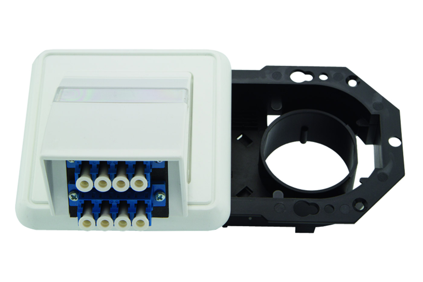 Zásuvka pro optickou kabeláž s LC konektory. Montáž do kabelového kanálu.;