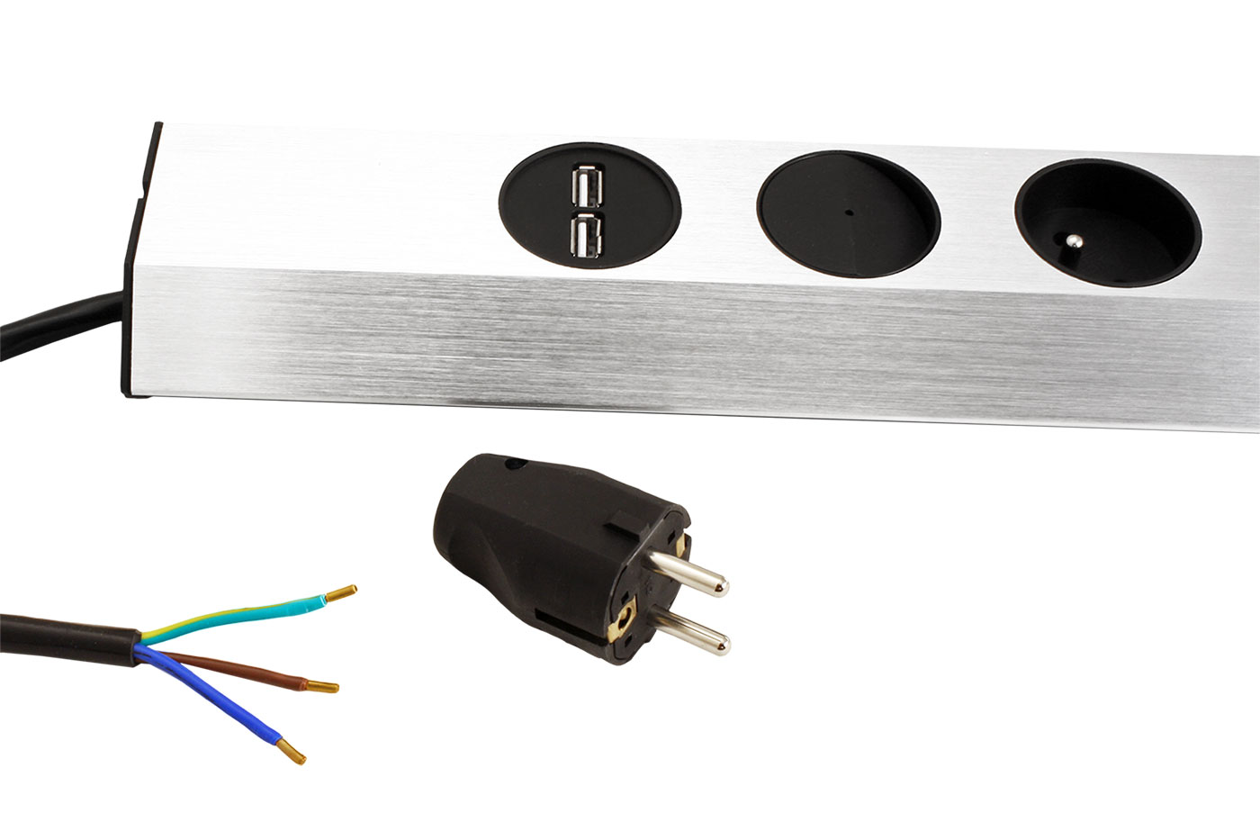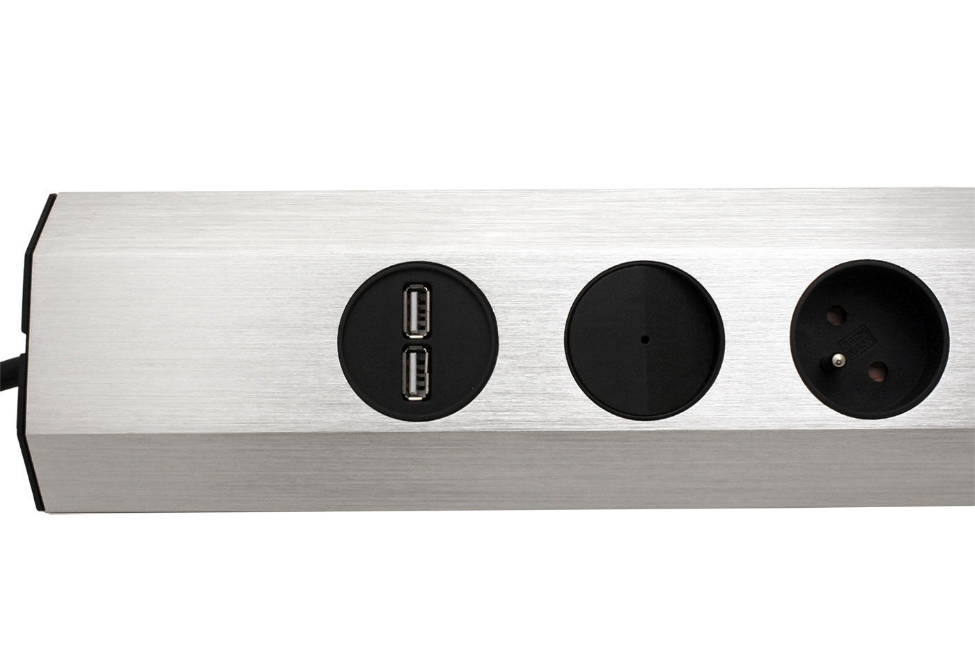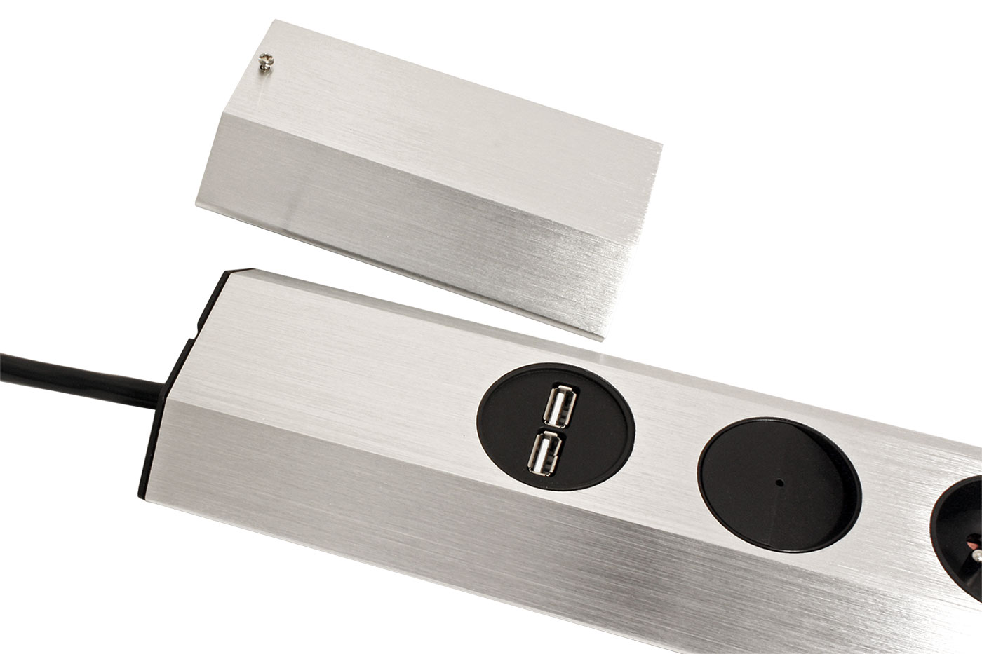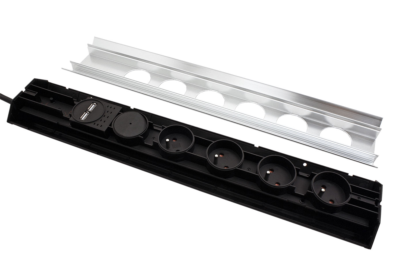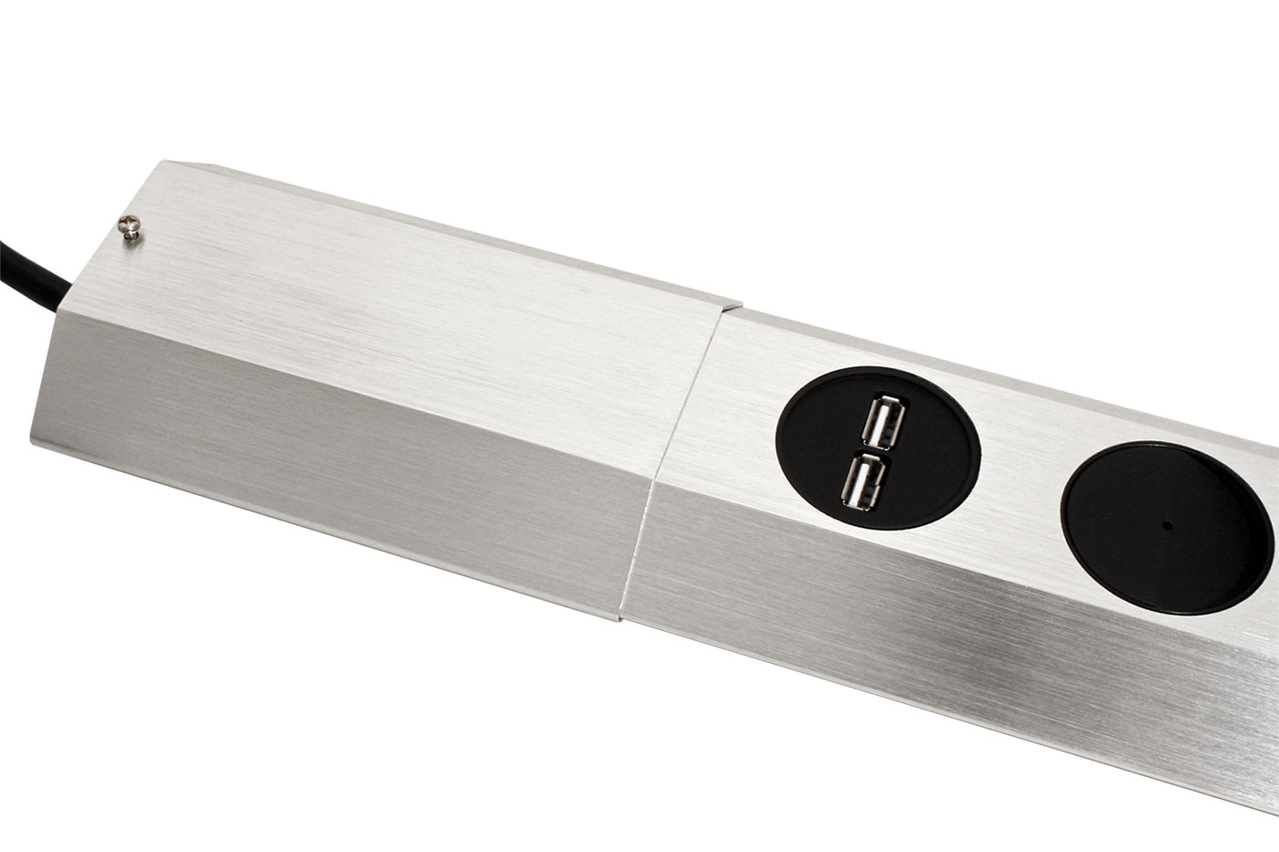 Elegantní přípojné místo se síťovými zásuvkami a 2 USB zásuvkami. Lištu je možno montovat na stěnu, nebo do rohu. Je vybavena krycím plechem, umožňujícím zakrytí zbývající části rohu (do max. délky 58cm)